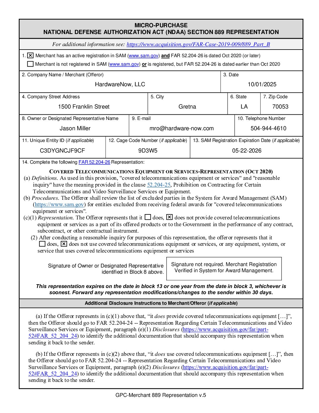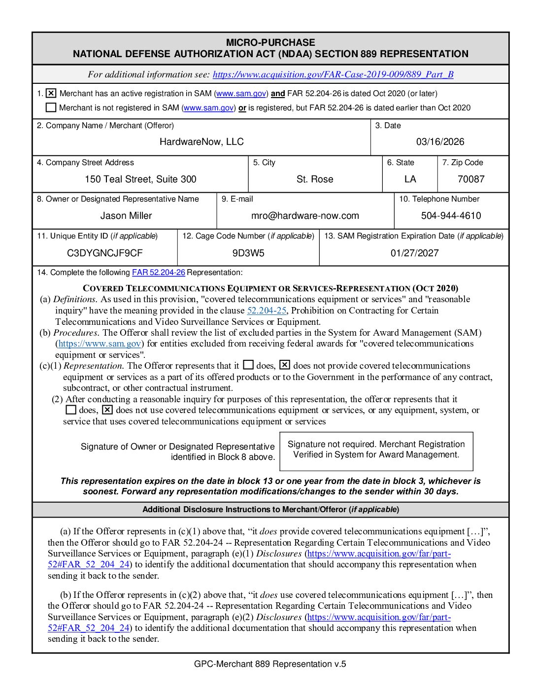 FORM 889 REPRESENTATION